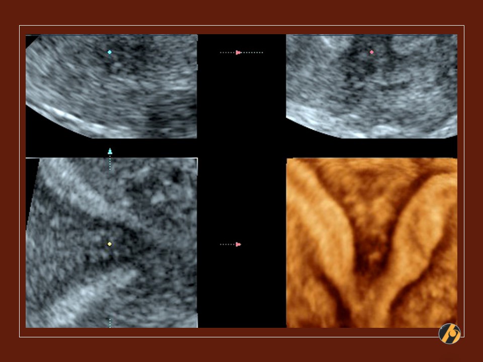 3D prikaz maternice u 3 ravnine, kao i rekonstrukcija slike maternične šupljine. Maternična šupljina / kavum maternice, ali i vrat maternice / cerviks podijeljeni su oštrim septumom u dva potpuno odvojena dijela, pri čemu je fundus zaravnjen. Zaravnjen fundus je ultrazvučna potvrda septirane / pregrađene maternice. U ovom slučaju je nužna operativna histeroskopija i resekcija septuma prije planiranja trudnoće, pošto su otežani zanošenje i iznošenje trudnoće. Češći su spontani pobačaji i prijevremeni porod.