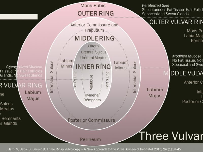 Vulvoskopija tri prstena omogućuje preciznije kliničko mapiranje i kategorizaciju lezija vulve, s posebnim značajem u diferencijalnoj dijagnostici cikličkih i necikličkih vulvarnih smetnji. Tehnika donosi dodatnu vrijednost u kliničkoj procjeni jer pomaže odrediti lokalizaciju oštećenja, specifičnost lezija i odnos nalaza sa simptomima, što može utjecati na plan praćenja, prevencije i terapije.