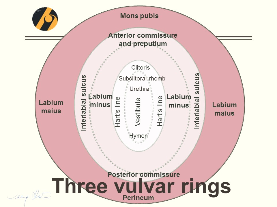 UNUTRAŠNJI PRSTEN VULVE (Inner ring of the vulva) – klitoris, subklitoralni romb, Hartova linija, introitus vagine, ušće uretre, Skeneove i Bartholinove žlijezde, himen i vestibularni prostor.