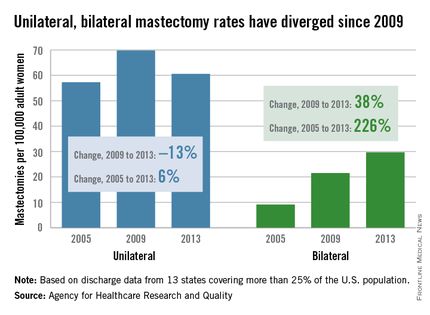Stopa bilateralnih mastektomija skočila je 226% u tom razdoblju, između 9.1 na 100,000 odraslih žena u 2005. i 29.7 na 100,000 u 2013. Stopa jednostrane mastektomije, porasla je s početnih 57.3 na 100,000 žena u 2005. godini na 69.8 u 2009. godini, a zatim je pala na 60.6 u 2013. godini, što je sveukupni porast od 6%, izvijestila je AHRQ.
